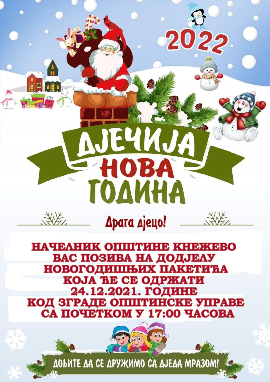 Тим поводом, начелник Општине Кнежево, позива сву дјецу Кнежева да дођу на дружење са Дједа Мразом и подјелу пакетића.