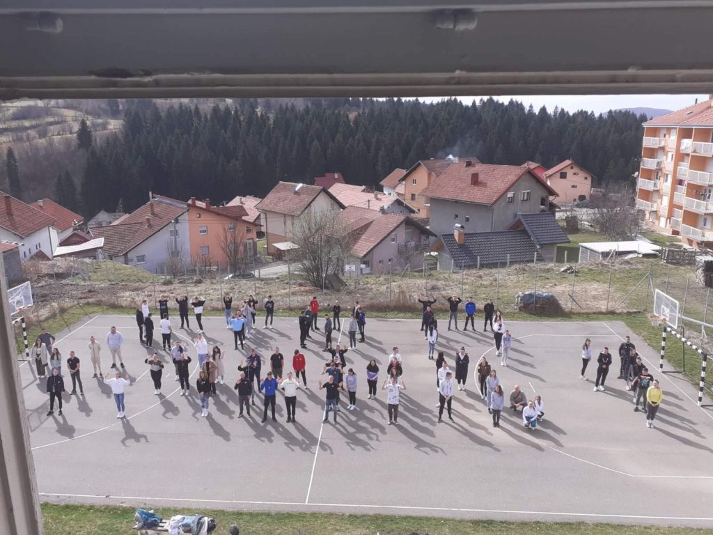 U kreiranju ljudske instalacije „STOP NASILJU“ učestvovale su učenici i profesori, njih oko 80, koji su svojim tijelima u stojećem stavu na igralištu ispod škole ispisali ovu poruku.