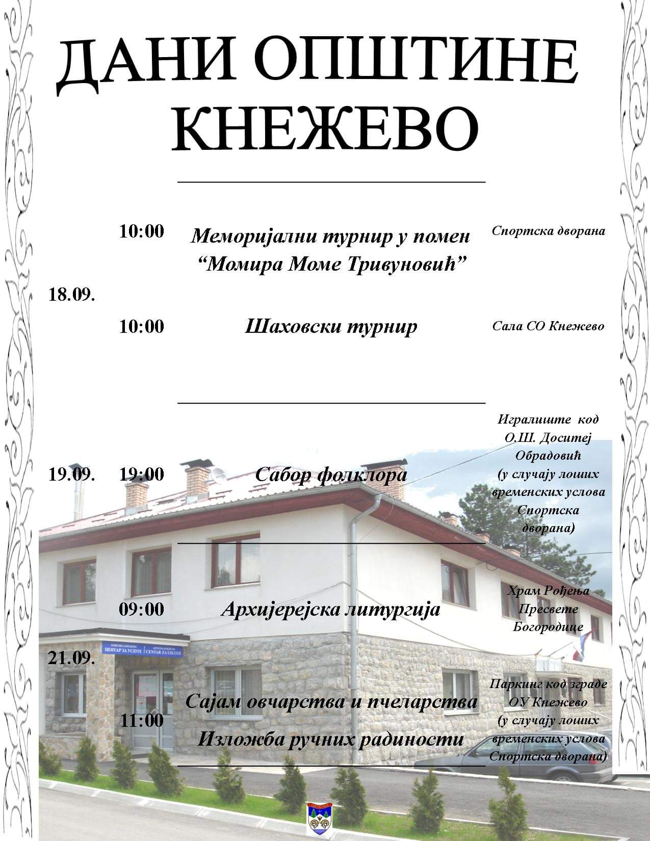 Поводом славе Општине и храма – „РОЂЕЊЕ ПРЕСВЕТЕ БОГОРОДИЦЕ“ – Мала Госпојина, Општина Кнежево у сарадњи са СПЦО Кнежево, организује манифестацију „Дани општине Кнежево“, која ће трајати од 18.09.-21.09.2021. године.