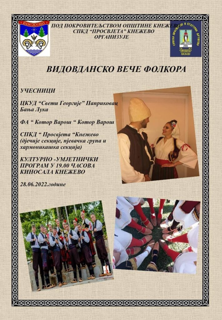 Manifestacija „Vidovdanski dani“ biće zaokružena organizovanjem aktivnosti „Vidovdansko veće folklora“ koju organizuje Srpsko prosvjetno kulturno-umjetničko društvo Prosvjeta Kneževo. Čuvari kneževske kulturne tradicije i običaja prestaviće se publici sa bogatim programom sa brojnim igrama i pjesma dječije sekcije, pjevačka grupa i harmonikaši. Program je predviđen za 19:00 časova u Kino sali. Ovaj put Vidovdansko veče folklora upotpuniće i nastupi gostiju i to: CKUD „Sv.Georgije“ Paprikovac – Banja Luka i FA „Kotor Varoš“ – Kotor Varoš.