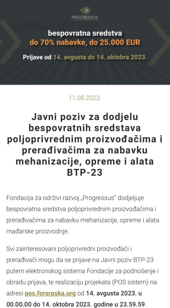 Opštinska uprava opštine Kneževo poziva poljoprivredne proizvođače sa područja opštine Kneževo na prezentaciju Drugog javnog poziva za dodjelu bespovratnih sredstava poljoprivrednim proizvođačima za nabavku poljoprivredne mehanizacije iz Mađarske.