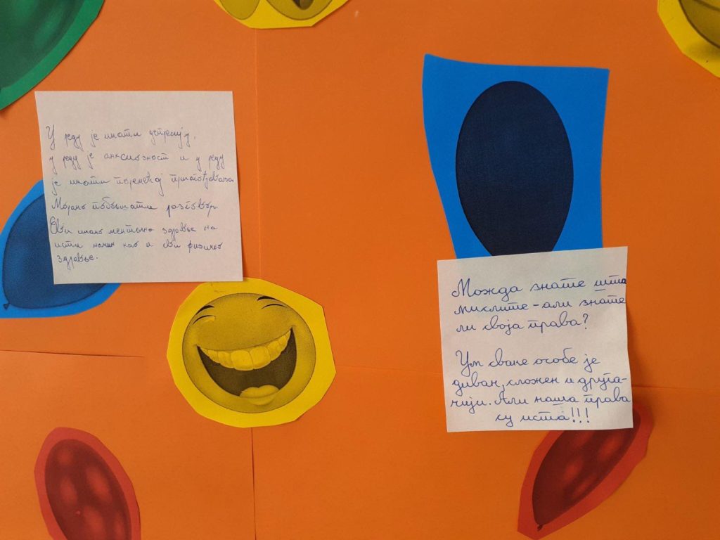 Učenici Srednjoškolskog centra „Jovan Dučić“ Kneževo obilježili su 10.oktobar – Međunarodni dan mentalnog zdravlja brojnim aktivnostima. Oni su povodom ovog dana podsjetili se na prava, slobode, odgovornosti i pristupačnoj zaštiti u oblasti mentalnog zdravlja. Tim povodom učenici i profesori su u znak podrške nosili zelene trakice, a zatim su na papirićima napisali neke savjete i poruke i zalijepili na oglasnu tablu. Učenice Jelena Karupović i Milica Filipović su spremile prezentaciju vezanu za mentalno zdravlje koju su prikazale ostalim učenicima na časovima odjeljenske zajednice.