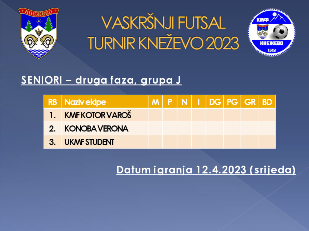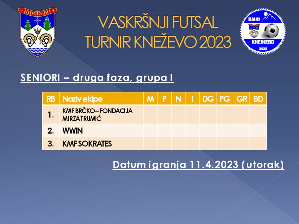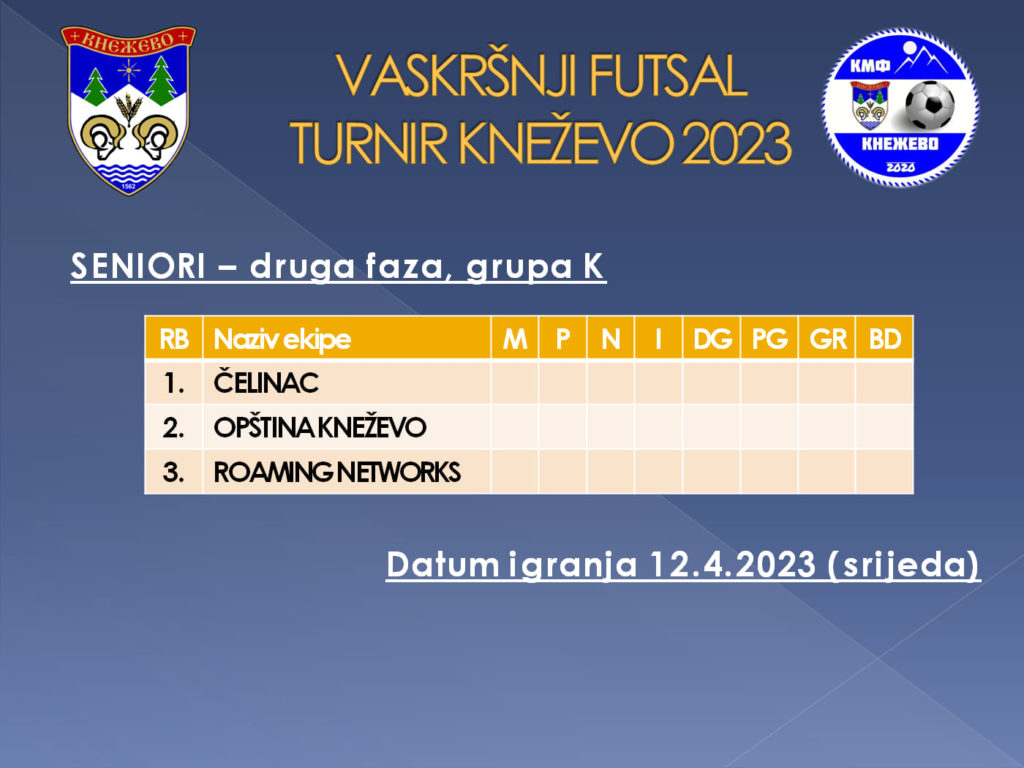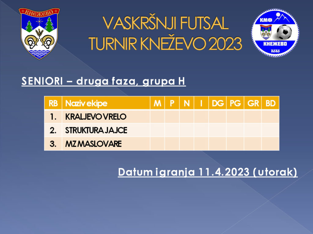 Utakmicama koje su odigrane u četvrtak i petak prošle sedmice završen je prvi krug futsal Vaskršnjeg turnira u Kneževu, a pobjednici ovih utakmica su izborili plasman u četvrtfinale u seniorskoj grupe, a veteranskoj grupi plasman u polufinale.